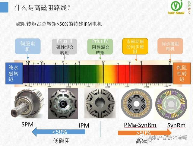 用“連續(xù)光譜”來形容SPM、IPM、PMa-SynRm、SynRm這四類電機(jī)有一個(gè)隱喻:就是這四類電機(jī)具有內(nèi)在同質(zhì)性,他們的定子結(jié)構(gòu)相同,控制硬件相同,控制算法類似。光譜上相鄰的兩類電機(jī),它們之間只是磁阻比例量的不同,沒有質(zhì)上的區(qū)別。這種連續(xù)性給技術(shù)漸進(jìn)發(fā)展帶來了有利條件。因此高磁阻技術(shù)路線,可以理解成在現(xiàn)有IPM電機(jī)路線上的繼續(xù)發(fā)展,可以叫它“特殊的IPM”電機(jī)也可以叫“PMa-SynRm”。